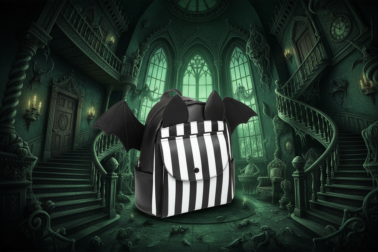 The Nightfall Bat Backpack by BANNED Apparel is a striking gothic accessory featuring bold black and white vertical stripes with removable bat wings. This unique backpack combines playful Halloween aesthetics with practical everyday functionality. The distinctive design includes detachable black bat wings that can be added or removed to suit your style preference, making it versatile for both statement gothic fashion and casual wear.